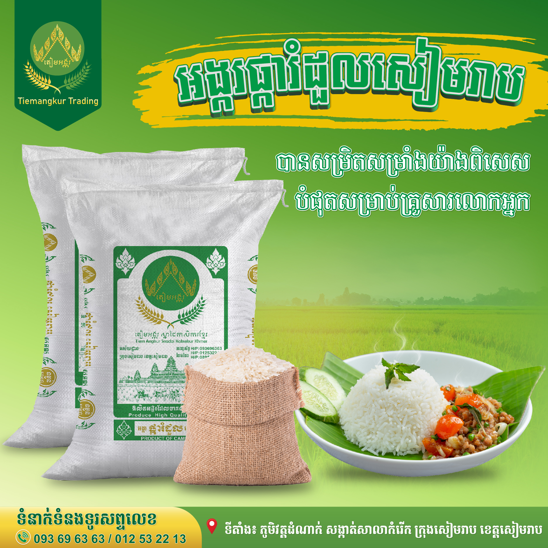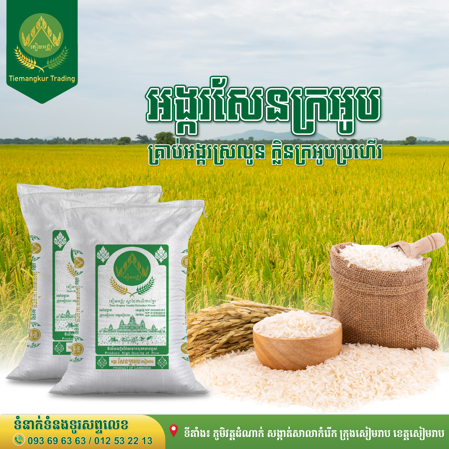 តៀមអង្ករ មានបោះដុំ លក់រាយអង្ករធម្មជាតិច្រើនប្រភេទដែលសុទ្ធសឹងជាស្នាដៃកសិករខ្មែរប្រកបដោយគុណភាពខ្ពស់។